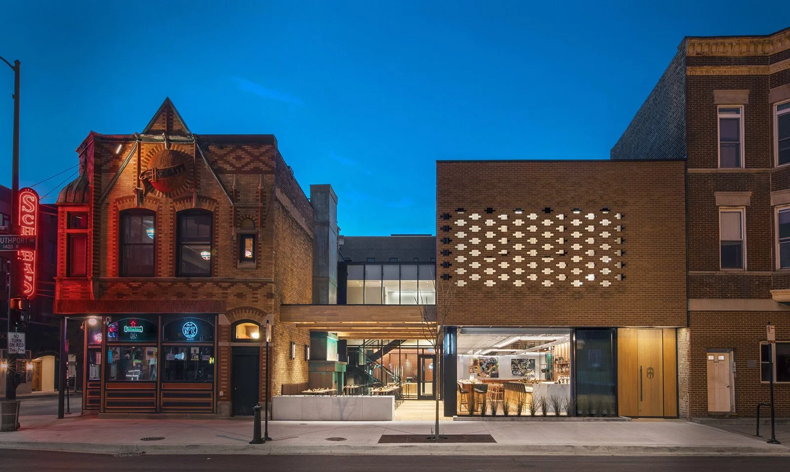 Tied House blends traditional materials with modern detailing, creating a space that feels connected to Schubas while establishing its own identity. The restaurant features layered masonry, custom millwork, and carefully integrated lighting elements, including a backlit screen wall that anchors the upper façade.